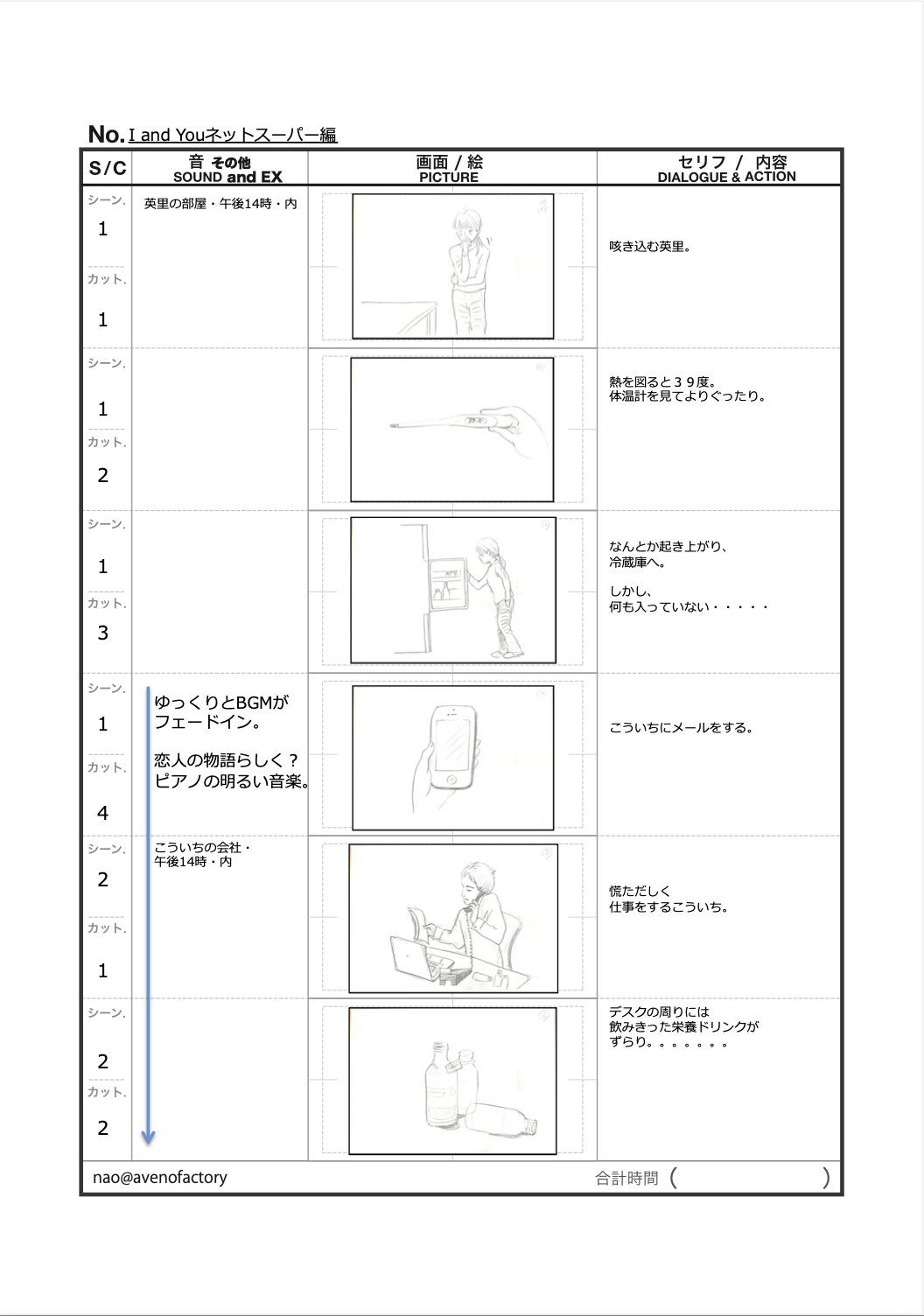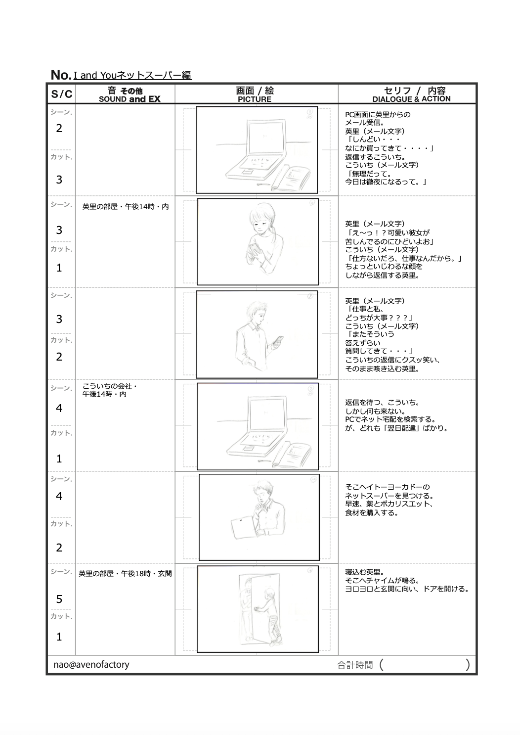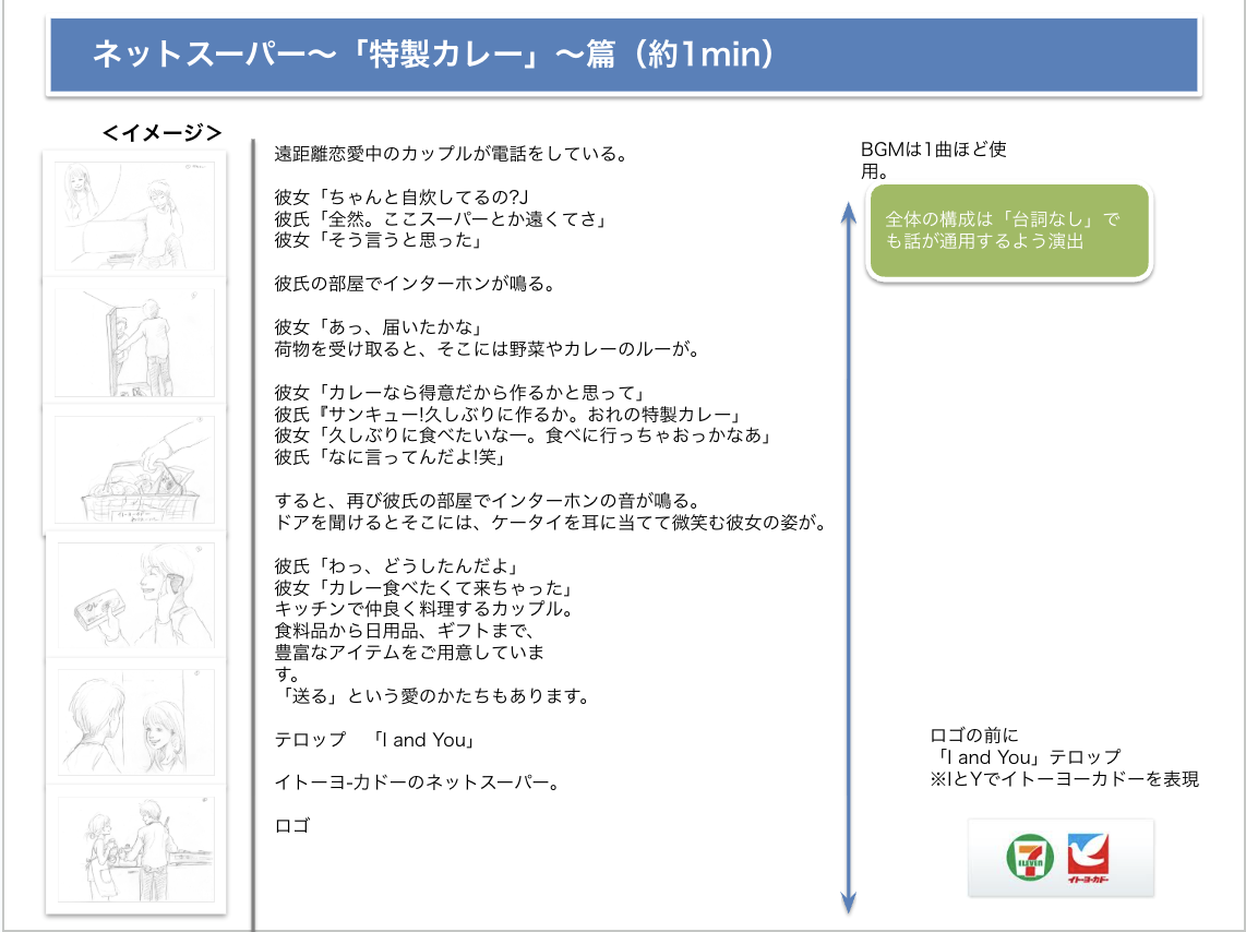 ターゲットと課題から、私たちは「遠距離恋愛」というシチュエーションを思いつきます。なかなか会えない彼女が、サプライズで彼の家にやってきて、ネットスーパーで食材を注文し、カレーを作ってあげる、というストーリーです。距離を縮めるサービスとして、ネットスーパーを描こうと考えました。