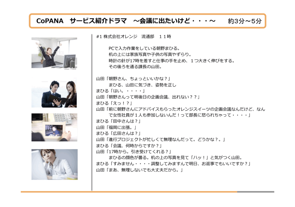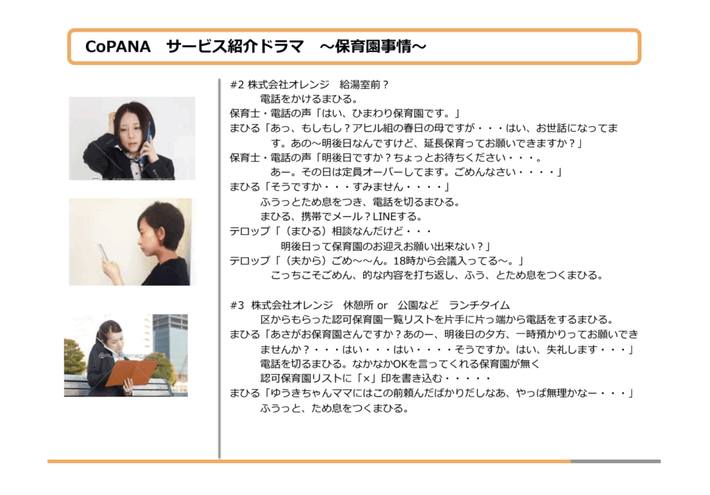 二回目の打ち合わせ。キャストや保育園のロケ地が決まったことを報告し、お客様に喜んでいただいたその場で、私と制作担当の中井くんで恐る恐る切り出しました。「あのー…ご相談なんですが…」「あ!いいですよ!日曜なら空いてますし」難航すると思っていたロケ地問題が、あっさりと解決してしまったのです。